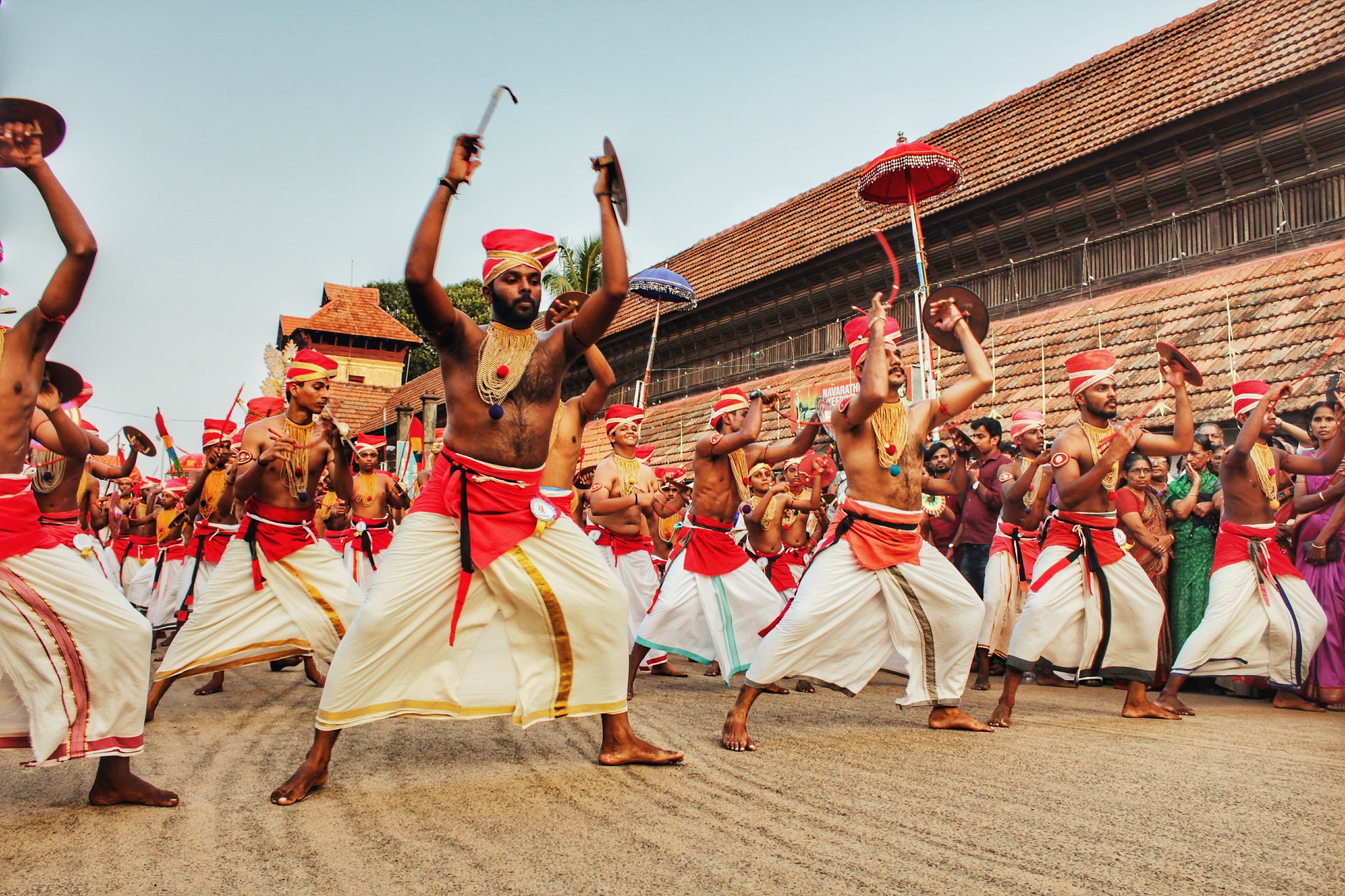 The elaborate costumes, swords and shields of Kalarippayattu are used as models in shaping the wooden weapons and costumes of Velakali. The art form is staged in accompaniment to a traditional orchestra. Dancers wear red turbans and dresses of soldiers of yore.