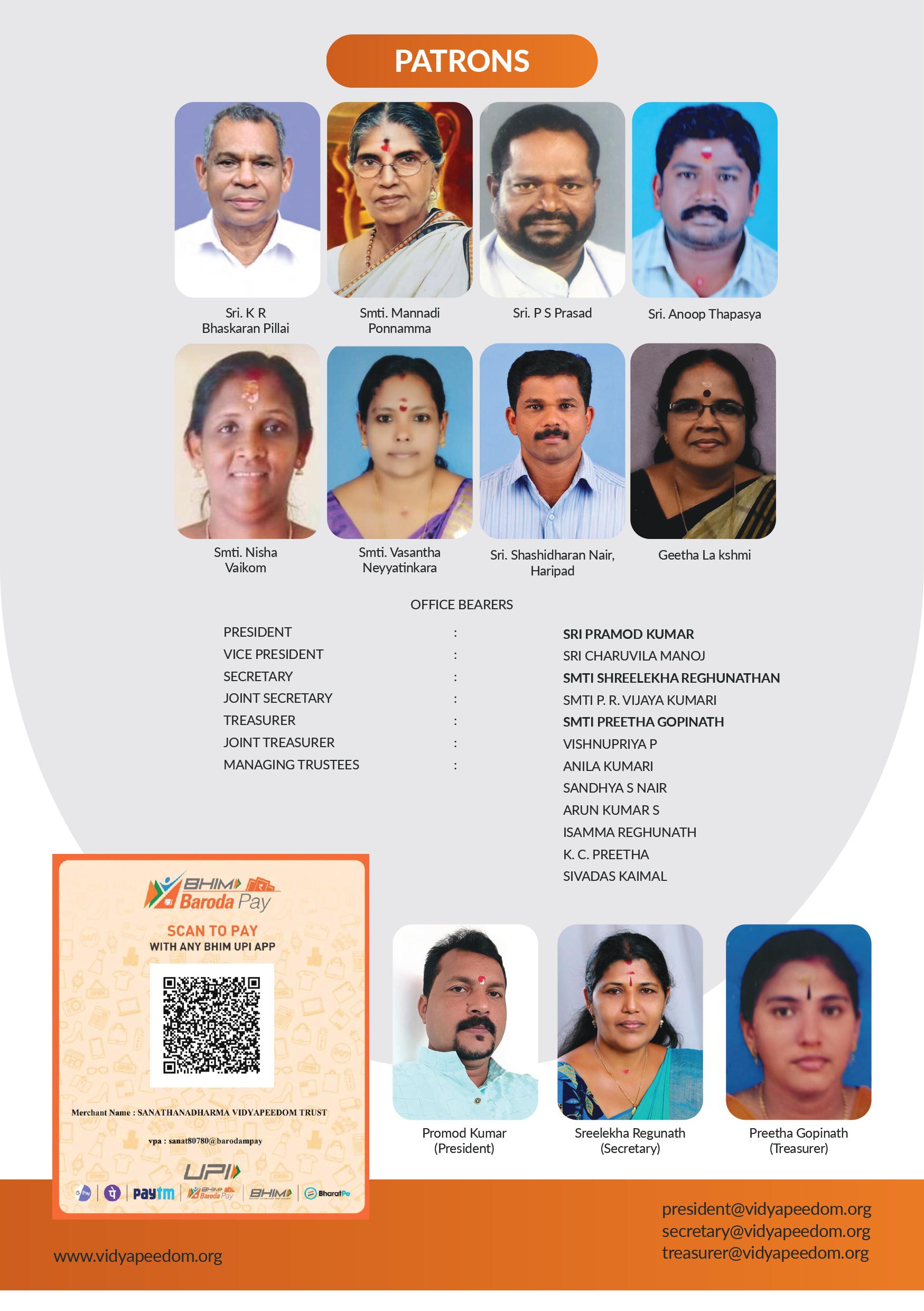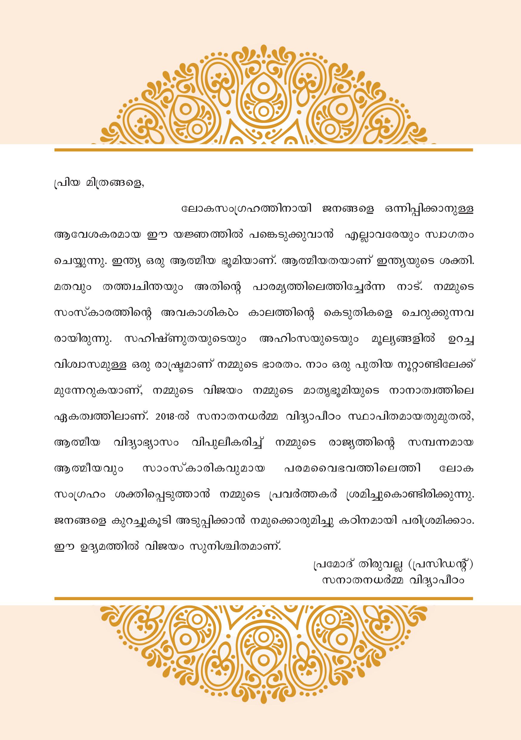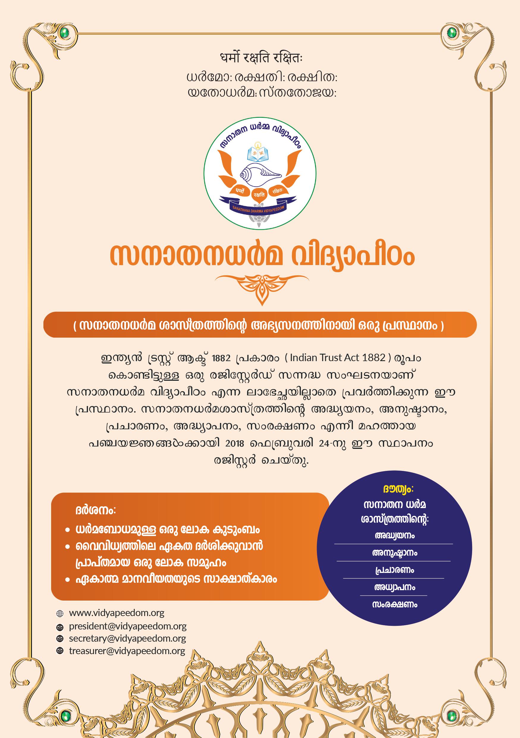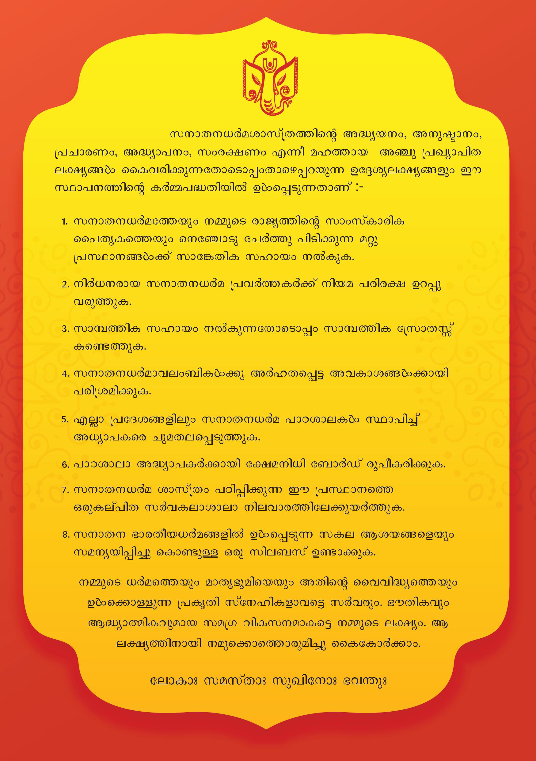 സനാതനധർമ വിദ്യാപീഠം എന്ന ഈ സ്ഥാപനം സനാതനധർമശാസ്ത്രത്തിന്റെ അദ്ധ്യയനം, അനുഷ്ടാനം, പ്രചാരണം, അദ്ധ്യാപനം, സംരക്ഷണം എന്നീ മഹത്തായ പഞ്ചയജ്ഞങ്ങൾക്കായി രൂപം കൊണ്ടിട്ടുള്ള ഒരു രജിസ്റ്റേർഡ് സന്നദ്ധ സംഘടനയാണ്. ജാതി, മത, വർഗ, വർണ ഭേദമില്ലാതെ, ലാഭേച്ഛയില്ലാതെ ലോകസംഗ്രഹത്തിനായി പ്രവർത്തിക്കുന്ന ഒരു മഹൽ പ്രസ്ഥാനമാണിത്. ഉദ്ദേശ്യ ലക്ഷ്യങ്ങൾ 1. അദ്ധ്യയനം ( Study : Establish a Universal Library ) 2. അനുഷ്ടാനം ( Practice: Promote ceremonial events ) 3. പ്രചാരണം (Publicity : of the Sanathan Dharma Cult ) 4. അദ്ധ്യാപനം ( Teach : Establish Study Centers ) 5. സംരക്ഷണം ( Protect : Secure Sanathan Dharma Cult )